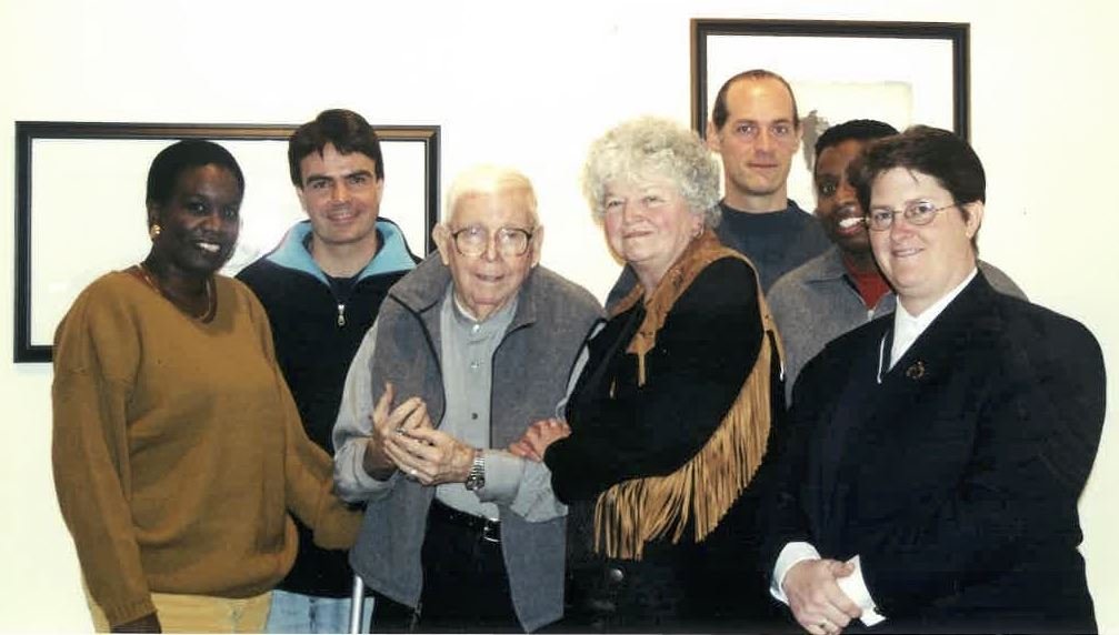 GGVI: Sydney 2002 Registration Party hosted by LA 2006, Inc. (Gay Games VII bid finalist),David Bohnett CyberCenter, Ed Gould Plaza, Los Angeles Gay & Lesbian Center, mid-2001. L-R: Board members Barbara, Karl Lott, Honourary Co-Chairs Morris Kight (the Father of the Los Angeles queer community) and Author-Athlete-Activist Patricia Nell Warren; and Board members Shamey Cramer, Christine Nelson and Denise Seifried.