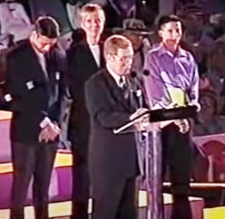 Justice Kirby at 2002 Gay Games VI Opening Ceremony with FGG Co-Presidents Roberto Mantaci and Kathleen Webster behind him