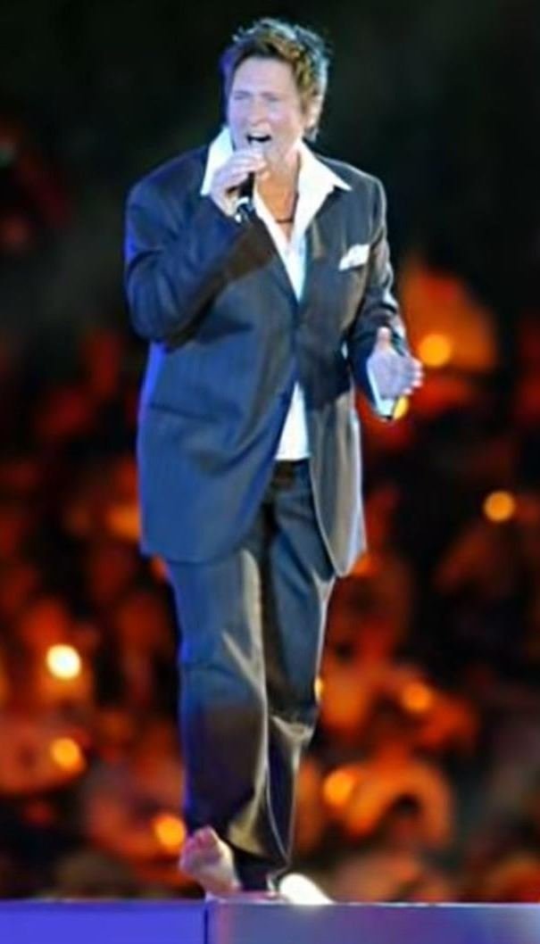 Barefoot k. d. lang singing "You'll Never Walk Alone" at Gay Games VI Opening Ceremony.