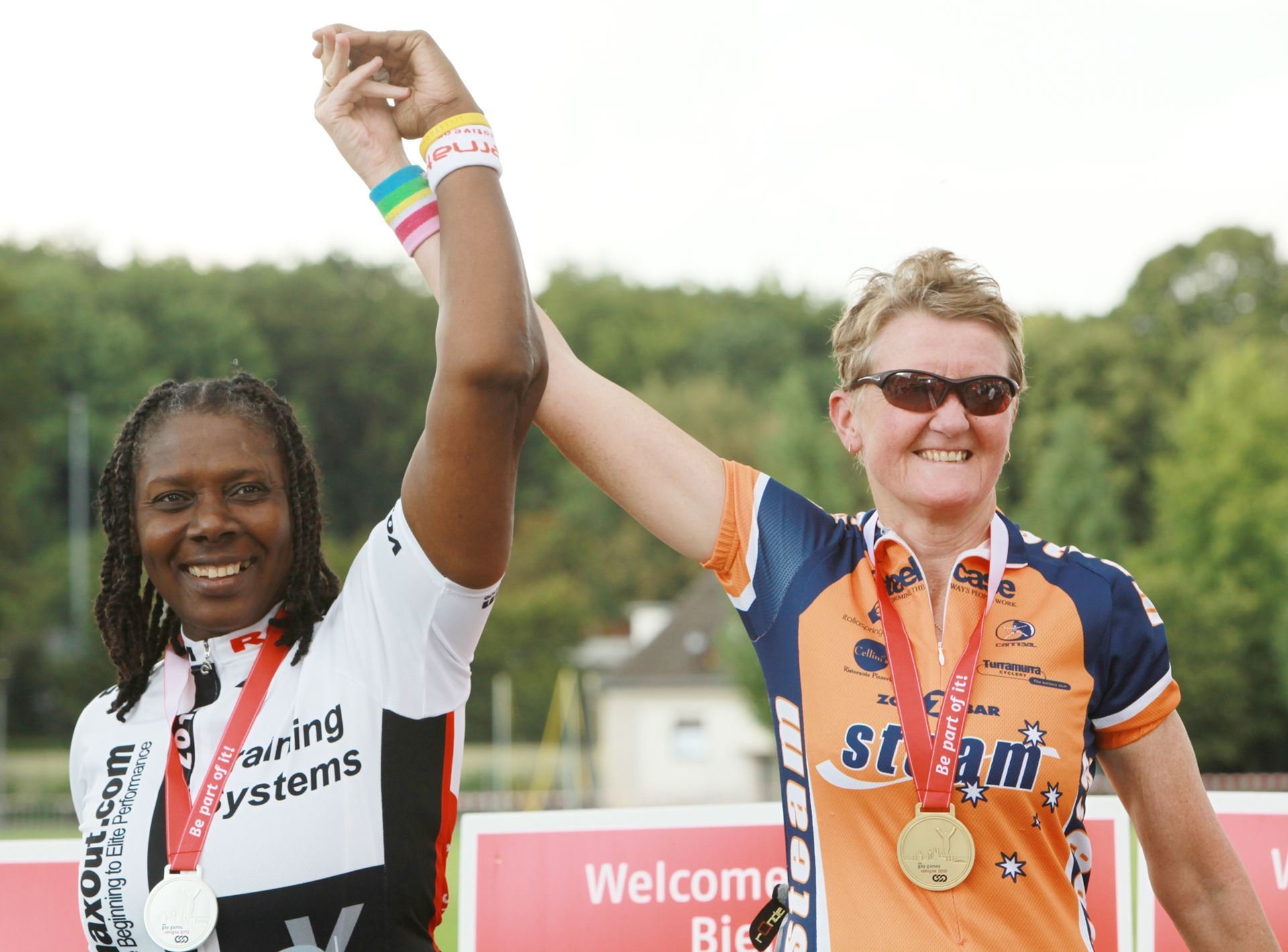 Kate Rowe (right) receiving a cycling medal at GGVIII. Photo: Rendel Freude