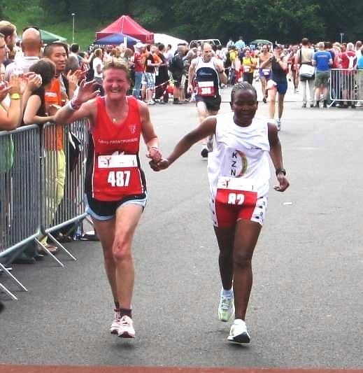 Kate Rowe and Hlengiwe Buthelezi crossing the 10K finish line in Cologne