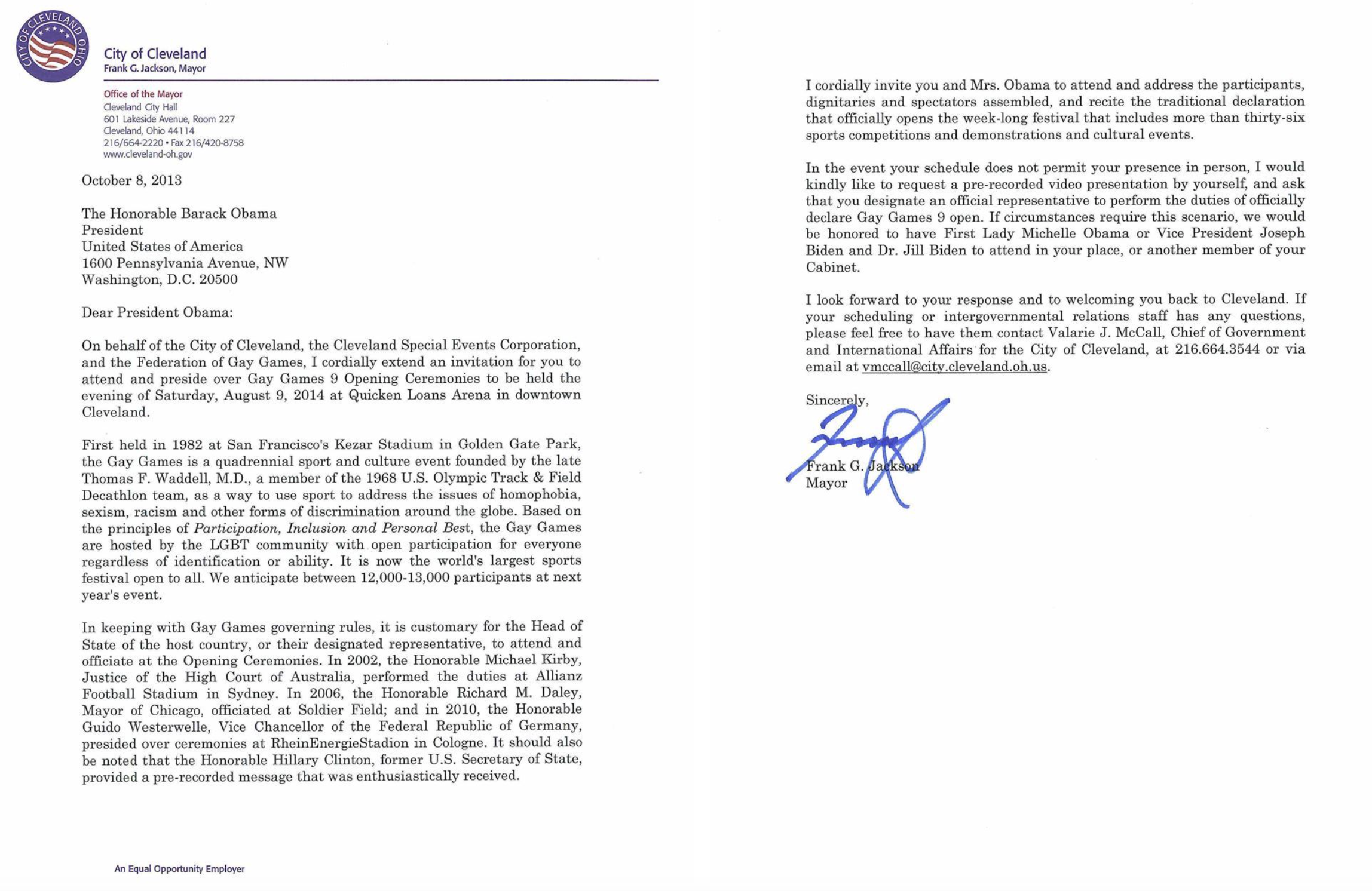Understanding the massive amounts of similar requests the White House receives on a daily basis, with the odds against us, I felt it best to not even let anyone know the request was being put into action. Those who were aware included Gay Games 9 Board member Gregg Levine and myself, GG9 CEO Tom Nobbe, Emy and Kurt, and later Joanie and producer Patrick Roberge; and Valarie McCall, representative for Cleveland Mayor Frank Jackson.