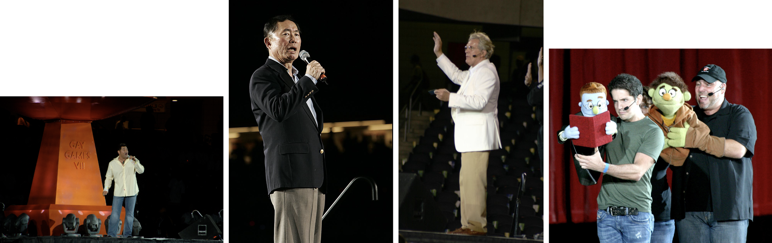 Gay Games VII: (L to R) Esera Tuaolo, Geiorge Takei, David Kopay, Broadway cast of Avenue Q