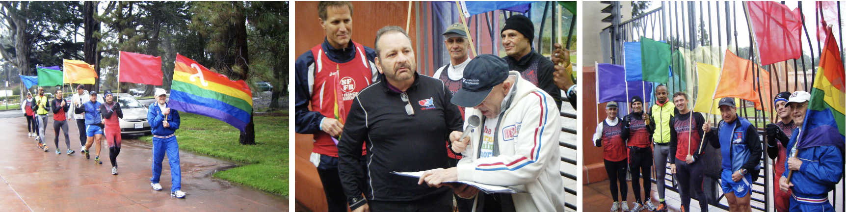 The rainy 2014 International Rainbow Memorial Run, held just outside historic Kezar Stadium, the site of GGI and GGII. Reggie Snowden holds the green flag. The center photo shows Gene Dermody holding the microphone for Brent Nicholson Earle, who is wearing Tom Waddell's 1968 Olympic warm-up jacket.
