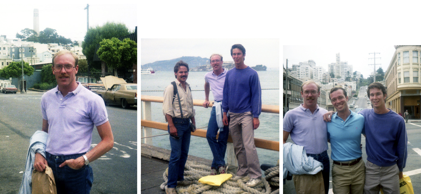CHARLIE CARSON: Fly TWA to San Francisco. Things are fun right away. Athletes identify each other with big grins upon landing – I meet a group of Los Angeles swimmers and we share a van into the city. One, Frank Maciejewski, turns out to be the third housemate with me and Jeff at Dominic Galardi’s house, as many residents offer hosted housing. We head to Registration to pick up our participant packet and then the San Francisco State University pool to loosen up. Discover the sometimes-chilly S.F. August air. Dinner at the Norse Cove with Frank and Rafael Montijo (who would become one of International Gay & Lesbian Aquatics’ co-founders). Jeff and I go to L.A. swimmers’ team meeting at the Hilton – lively group, and there are so many they’ve divided into L.A., Beverly Hills, and Santa Monica to get around the “one swimmer per city” rule (ha!). Undercurrent on the street is about the USOC’s lawsuit a few weeks back that stopped the use of the word Olympic in between the two words Gay Games.