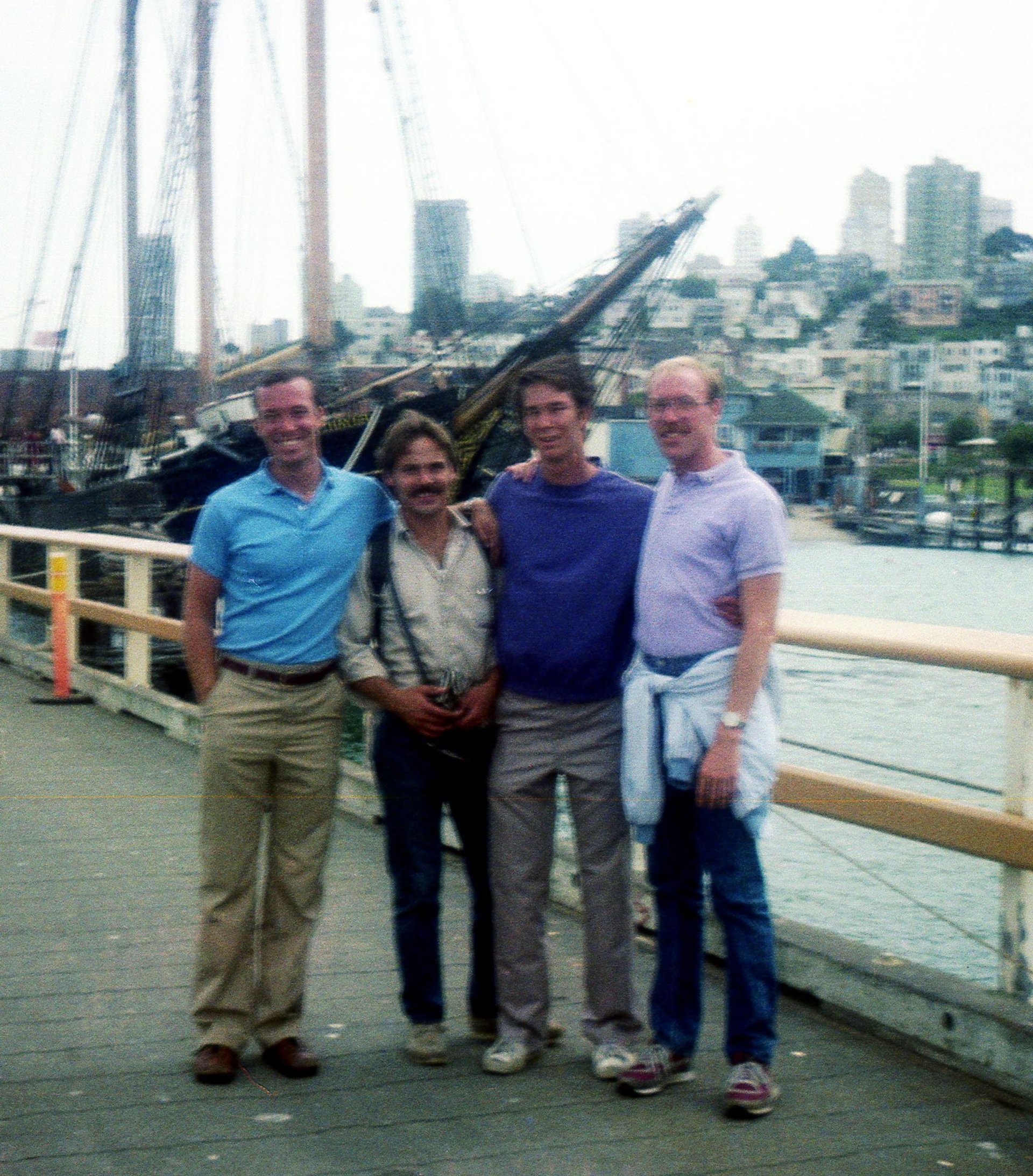 Meet Ron, Jeff and Frank on Castro to tour and run into Rose de Castro. Castro Café – it’s a Castro fiesta! – and see Chris, J.P. and others. Tour the town. Shop at Headlines. Guy recognizes us and yells from his car about Esther Williams last night (!). Physique competition tonight at Castro Theater is sold out. MUNI to Powell and get cable car – it breaks down in Chinatown. Talk to Denver family with 3 polite blond boys in shorts (“Thank you, sir.”). Everyone, local or tourist, seems nonplused about the Gay Games taking place. Walk to Fisherman’s Wharf and Ghirardelli Square – touristville, including us. Maritime Museum and Frank finds a man’s wallet lost in the toilet (yech). Take pictures on pier and Jeff collapses on the lawn with a cigarette. Chilly; goosebumps make my shaved legs and chest hurt. Ron and Frank change their travel to Sunday evening so they can be at the closing ceremony. Eat at Marcello’s.