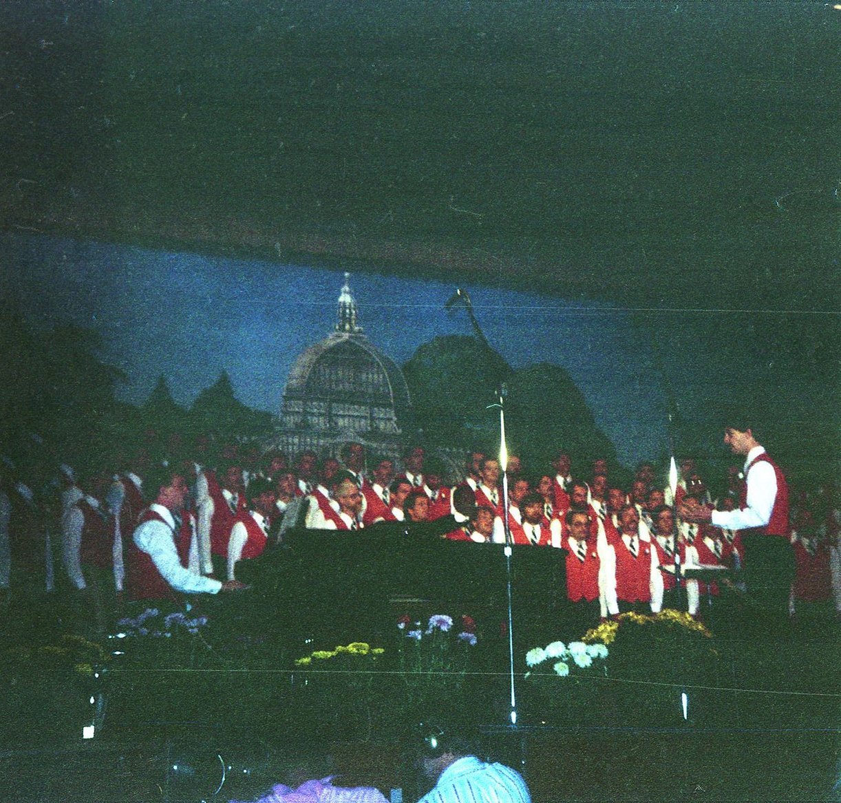 Attend the West Coast Gay Choral Festival dinner and show at California Hall and catered by Hal Herkenhoff, who gives me his business card to stay in contact after the Games. Sit with two members of New York’s Stonewall Chorale (a female/male chorus), in town as site-seers. Talk to Jeff and Frank of the Atlanta Gay Men’s Chorus, also site-seeing here and not sure their group will make it to New York for COAST. Very funny Carol Roberts entertains with her routine about being a foodaholic.