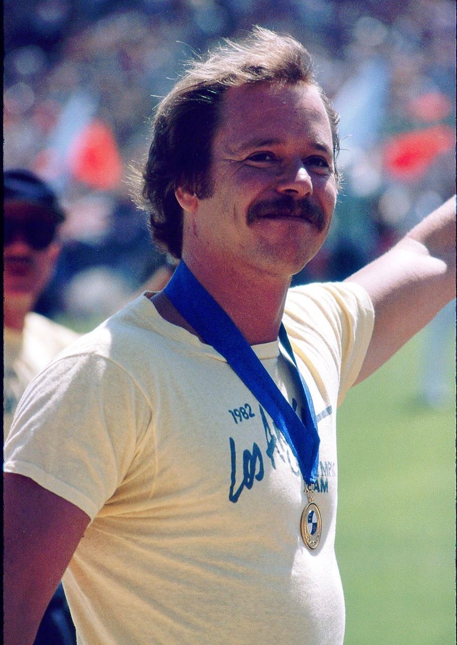 SHAMEY CRAMER: As we lined up to walk into Kezar Stadium for Closing Ceremonies in 1982, I was at the head of the contingent, directly behind Frank Medrano carrying the City of Los Angeles flag, and swimmers Richard Hunter and Ric Bohner carrying the Team Los Angeles banner. Of course, both of them were bare-chested, with Richard's 12 Gold medals shining brightly against his bronzed bare chest, perfectly set above his rippled 8-pack abs. He truly was the star of those Games, and the focus of many the camera, deservedly so.