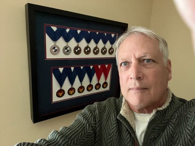 Doug Orloff in 2022 with his framed medals from Gay Games I and the 1983 Los Angeles Festival Games