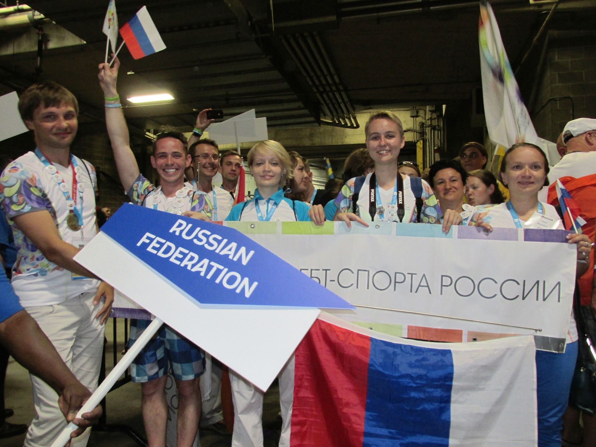 Konstantin Yablotskiye (far left) with Russian Sport Federation athletes at GGIX Opening Ceremony in 2014