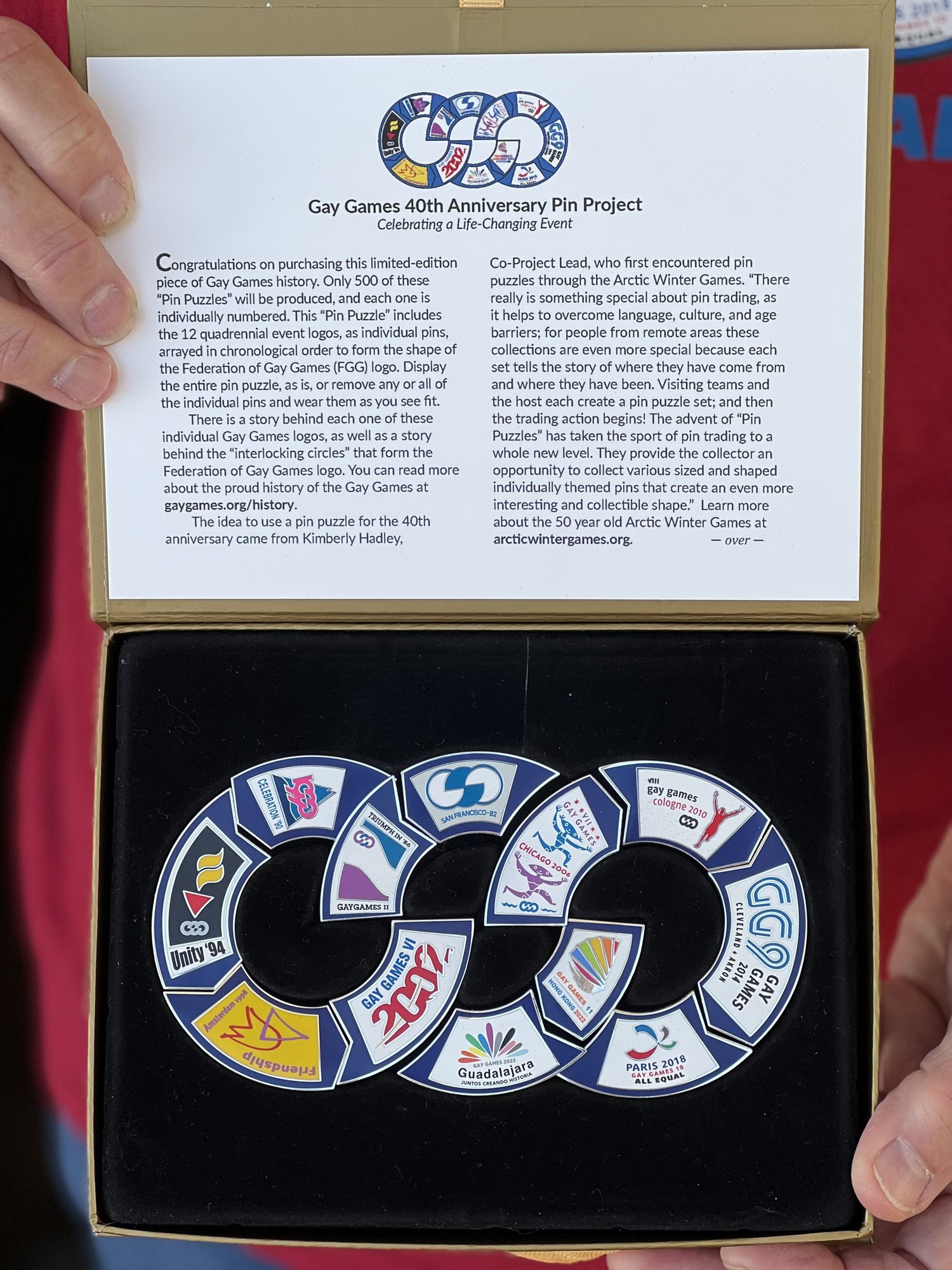 This limited-edition collectible "Pin Puzzle" is the perfect item for celebrating the Gay Games 40th Anniversary. It features 12 individual pins cleverly arranged in the shape of the iconic FGG logo. The 12 pins represent all 11 of the Gay Games plus the FGG's logo. The logo desire are pins for both Hong Kong and Guadalajara. A bonus pin showing the FGG logo is included. The pins may be removed from the "puzzle" and worn however you like, or left in the elegant gold ribbon box for displaying in your home. Inside the gold box, you'll find a glossy 2-sided printed card with the story behind this unique item.